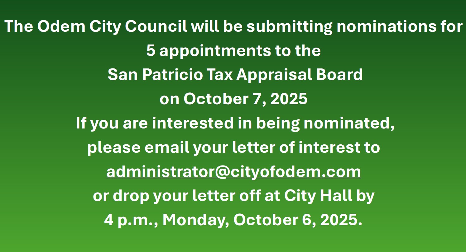 Odem City Council Nominations 23 days ago by City of Odem Web Team in City News 0 About City of Odem Web Team