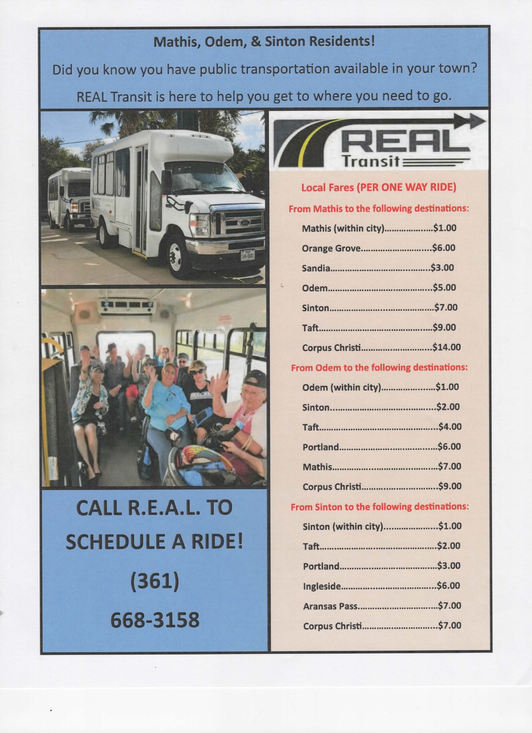 R.E.A.L. Transit provides accessible, affordable and available transportation service to transit dependent individuals and their families that improves the quality of life for themselves and their community. Transportation is provided for any person based on a fee schedule. Contact R.E.A.L. Transit directly at (361) 668-3158 to schedule your trip in advance and obtain the rates for your transportation needs.